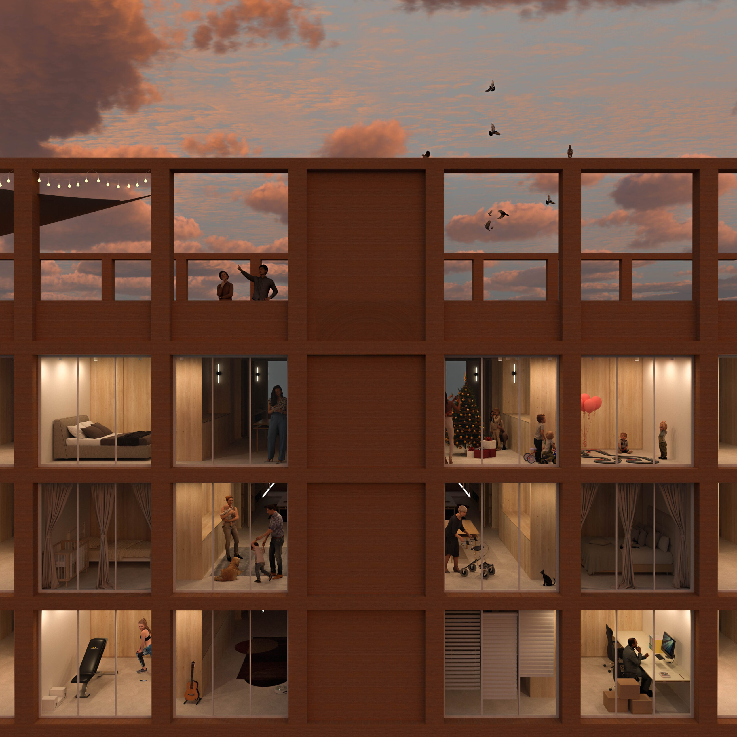 La totalidad del proyecto residencial esta basado en la adaptación y transformación, pero al mismo tiempo permite la ocupación de espacios semi-privados. Estos pueden ser ocupados de forma temporal o permanente permitiendo así augmentar el numero de espacios disponibles en uno, para visitas inesperadas, comidas familiares, o incluso espacio de teletrabajo.