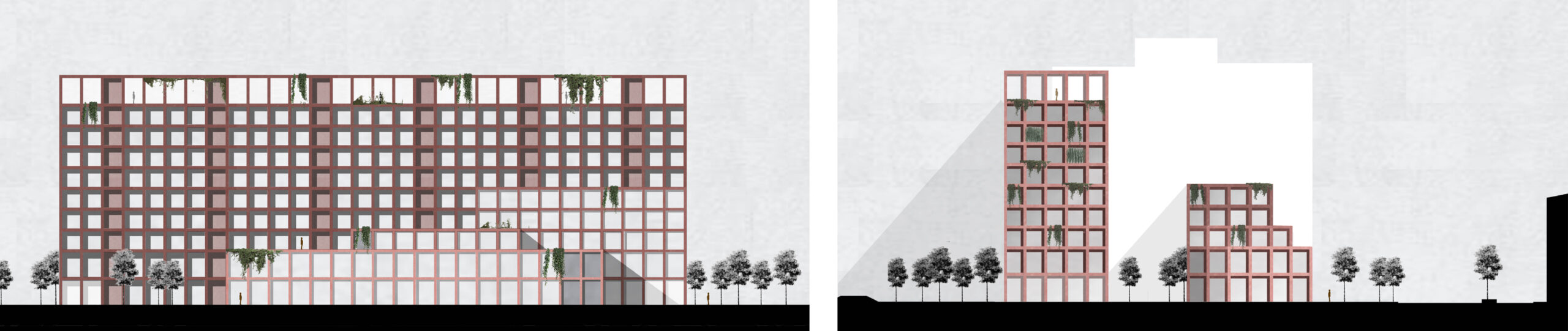 La ubicación del mercado delante del bloque residencial ayuda a reducir el cambio de escala entre ambos lados de la calla debido al volumen de viviendas solicitadas según programa, y ayuda al viandante a pasar sin dificultad a través del espacio generado.